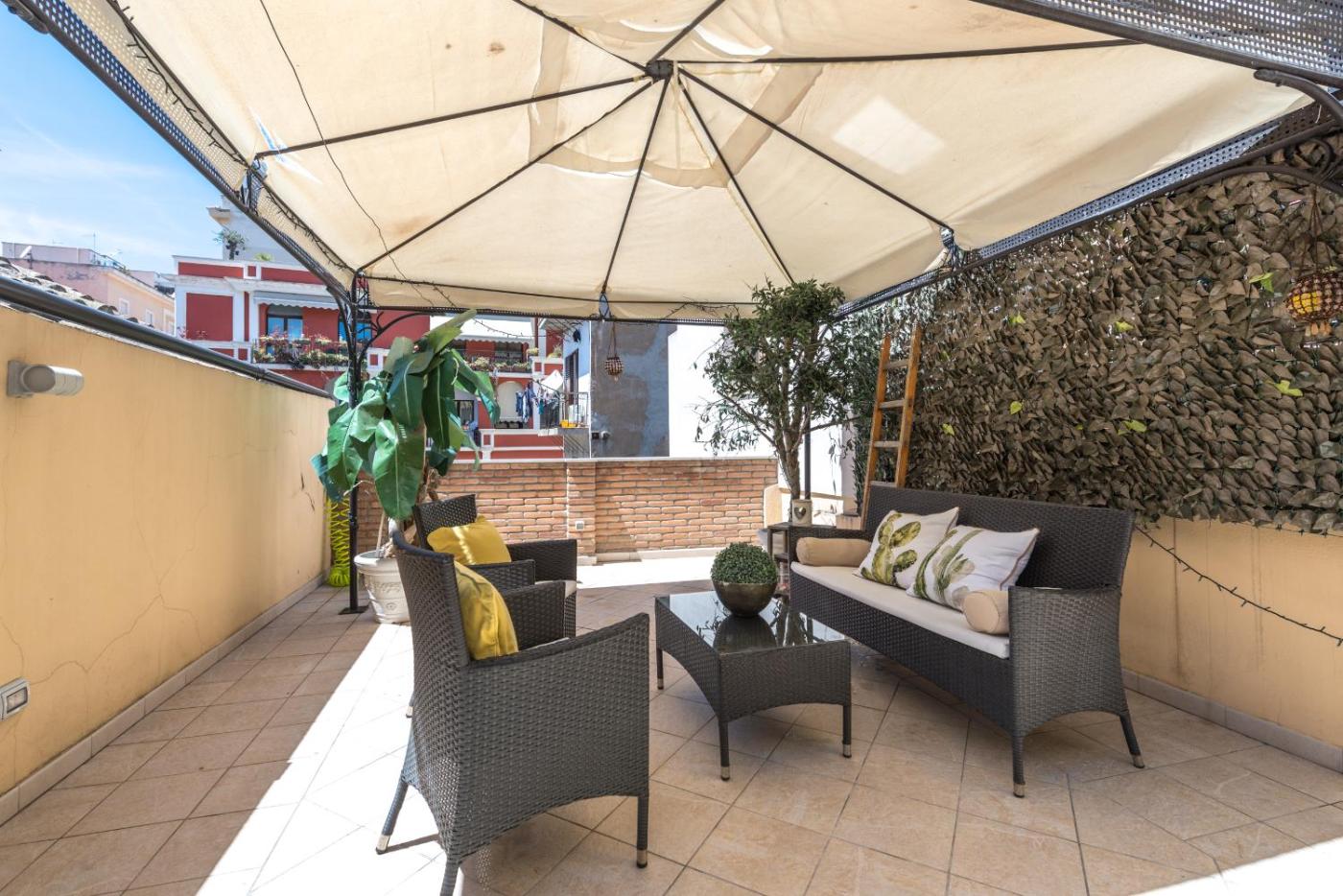 Questo appartamento con terrazza e vista sulla città offre 1 camera da letto, un soggiorno, una TV a schermo piatto, una cucina con utensili e 1 bagno con bidet e doccia. Presso questo appartamento troverete asciugamani e lenzuola tra i servizi disponibili.