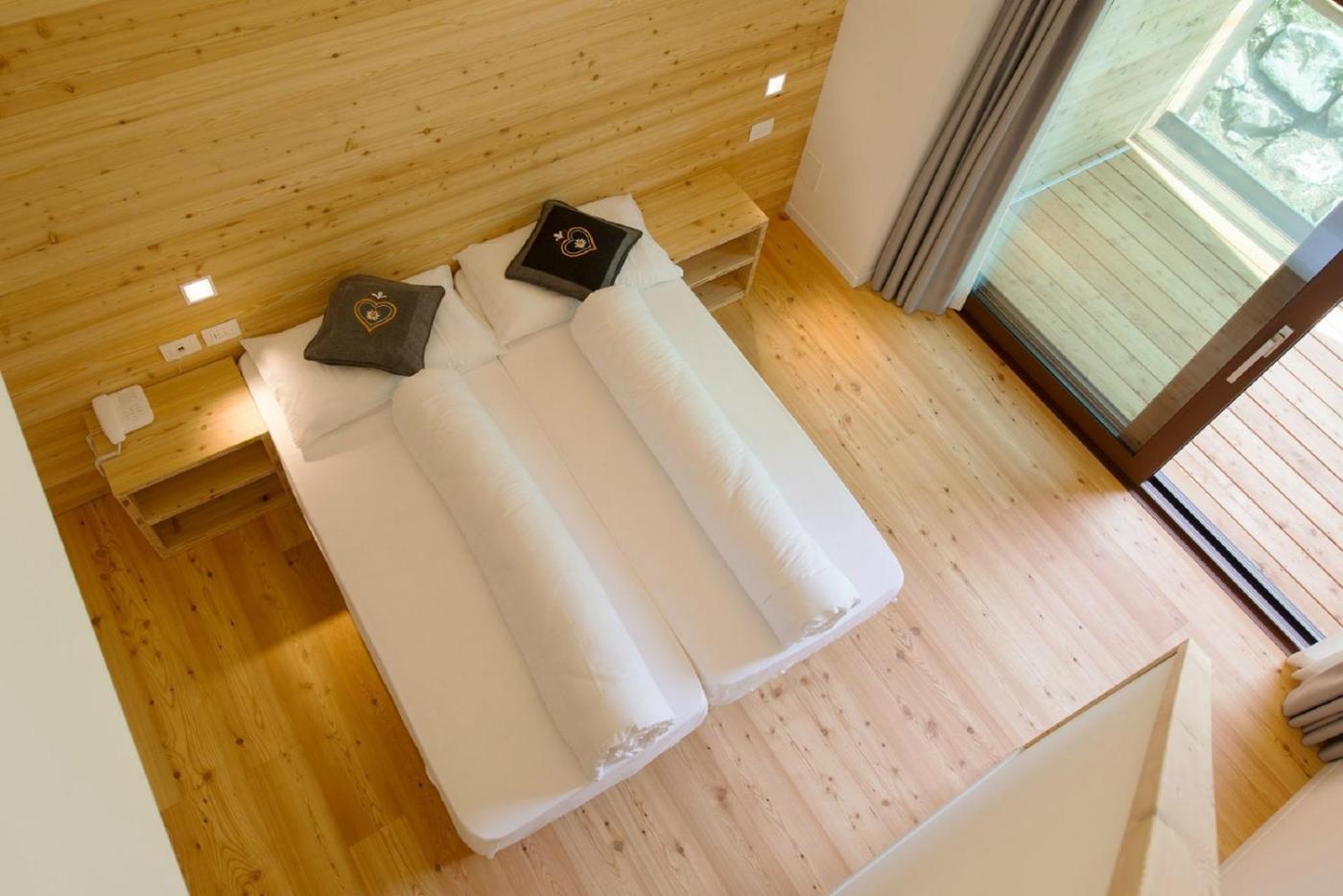 Camera Matrimoniale. Camera con arredi moderni in stile alpino, area salotto e terrazza con vista montagna. Il bagno privato è munito di asciugacapelli edi cortesia. ;